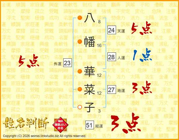 八(8画)幡(16画) 華(12画)菜(12画)子(3画)