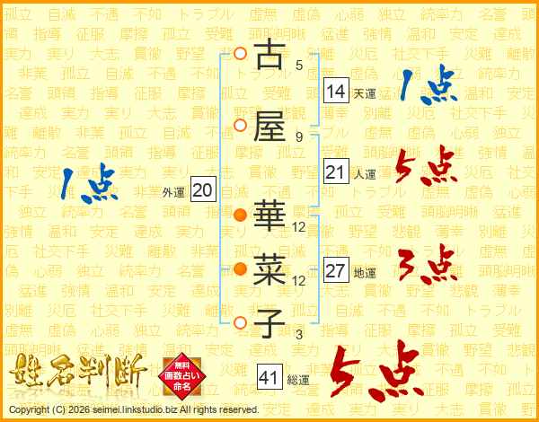 古(5画)屋(9画) 華(12画)菜(12画)子(3画)