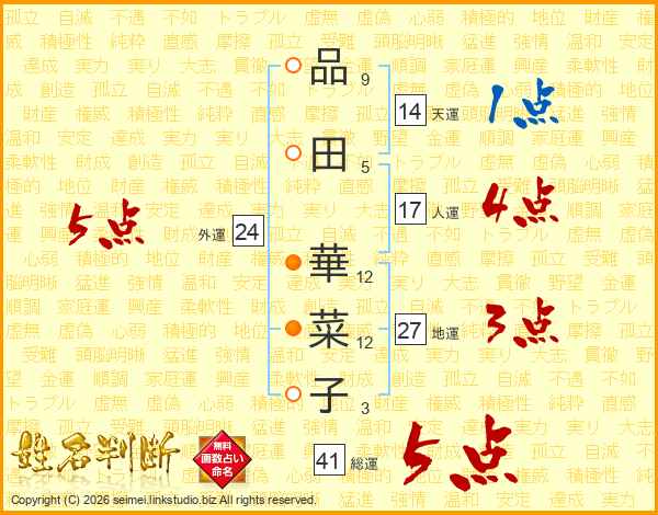 品(9画)田(5画) 華(12画)菜(12画)子(3画)