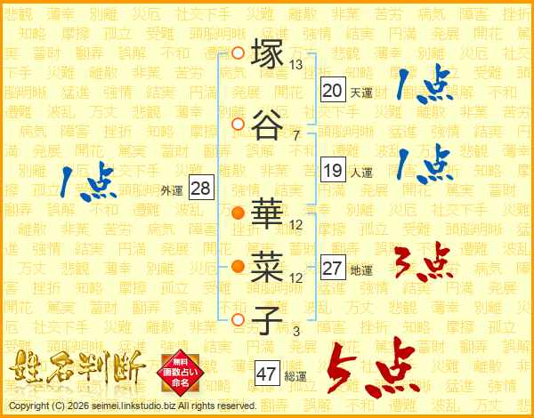 塚(13画)谷(7画) 華(12画)菜(12画)子(3画)