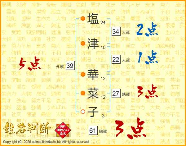 塩(24画)津(10画) 華(12画)菜(12画)子(3画)