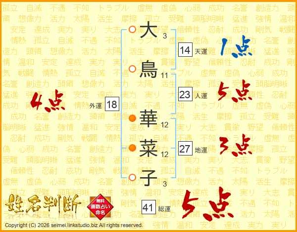 大(3画)鳥(11画) 華(12画)菜(12画)子(3画)