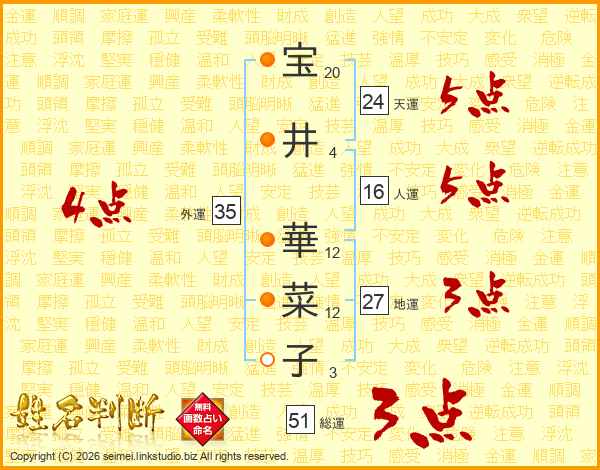 宝(20画)井(4画) 華(12画)菜(12画)子(3画)