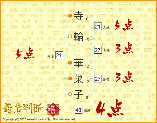 寺(6画)輪(15画) 華(12画)菜(12画)子(3画)