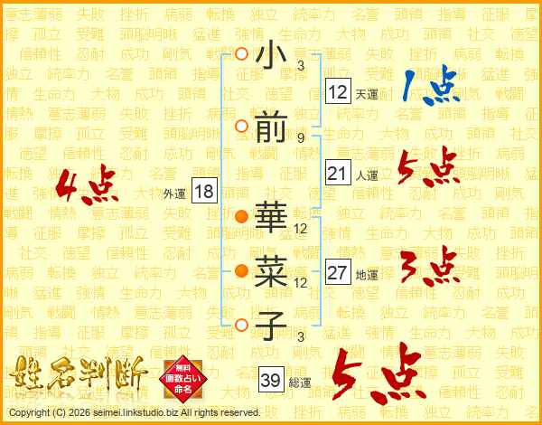 小(3画)前(9画) 華(12画)菜(12画)子(3画)