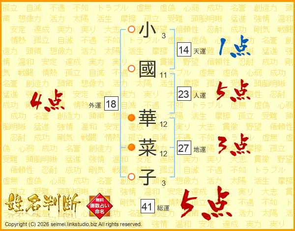 生活面を象徴する運勢です。外部から受ける影響力を表し、結婚運、家庭運や職場、環境への順応性を表します。総運から人運を引いた画数。姓や名が1文字の場合を除く。