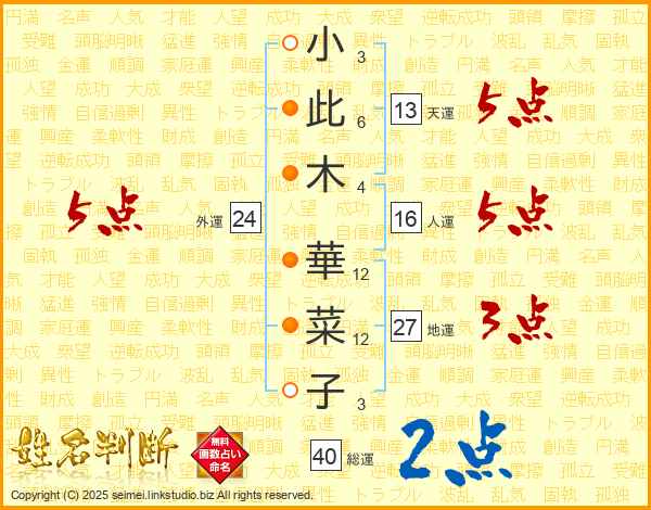小(3画)此(6画)木(4画) 華(12画)菜(12画)子(3画)