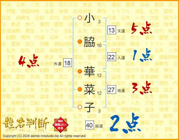 小(3画)脇(10画) 華(12画)菜(12画)子(3画)