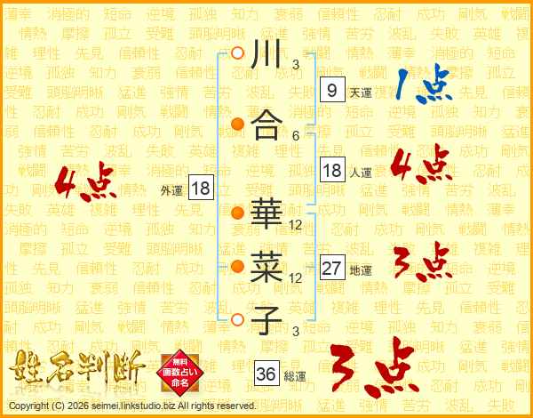 川(3画)合(6画) 華(12画)菜(12画)子(3画)