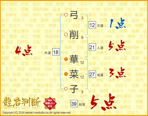 弓削華菜子さんの総運は39画の5点!