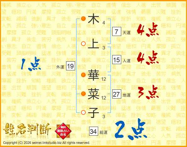 木(4画)上(3画) 華(12画)菜(12画)子(3画)