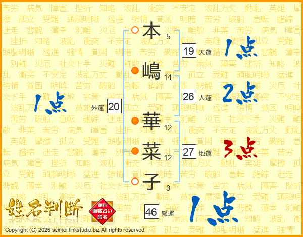 本(5画)嶋(14画) 華(12画)菜(12画)子(3画)