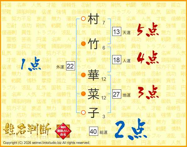 村(7画)竹(6画) 華(12画)菜(12画)子(3画)