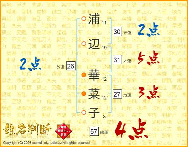 浦(11画)辺(19画) 華(12画)菜(12画)子(3画)