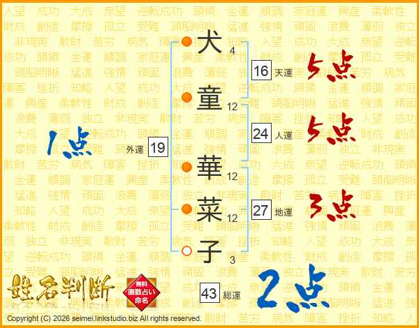 犬(4画)童(12画) 華(12画)菜(12画)子(3画)