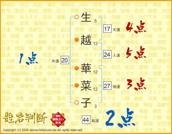 生(5画)越(12画) 華(12画)菜(12画)子(3画)