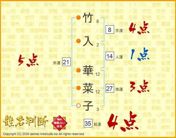 生活面を象徴する運勢です。外部から受ける影響力を表し、結婚運、家庭運や職場、環境への順応性を表します。総運から人運を引いた画数。姓や名が1文字の場合を除く。