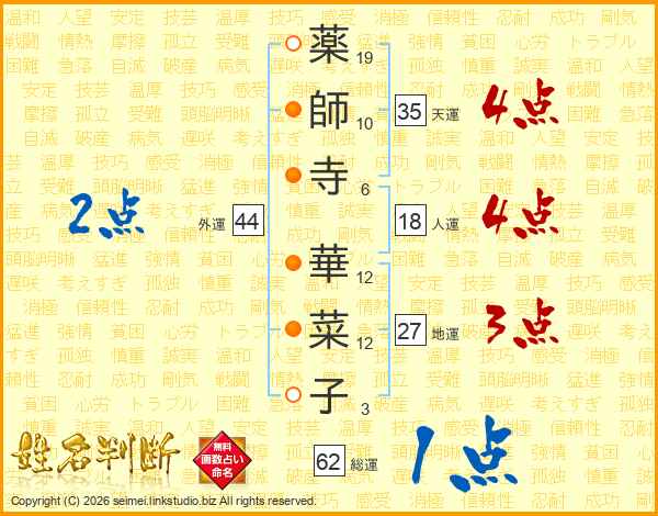 薬(19画)師(10画)寺(6画) 華(12画)菜(12画)子(3画)