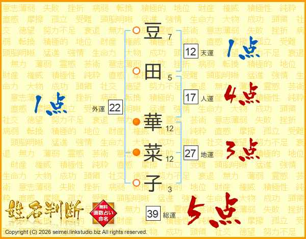 豆田華菜子さんの総運は39画の5点!