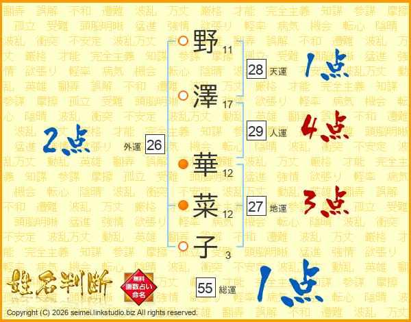 野(11画)澤(17画) 華(12画)菜(12画)子(3画)