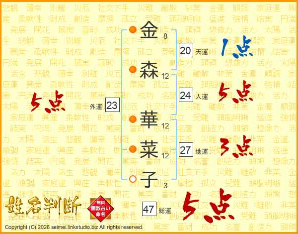 金(8画)森(12画) 華(12画)菜(12画)子(3画)
