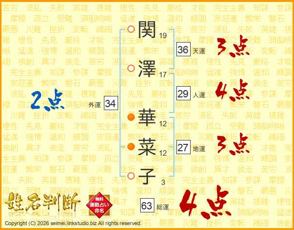 関(19画)澤(17画) 華(12画)菜(12画)子(3画)