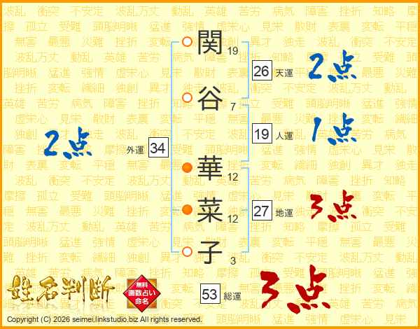 関(19画)谷(7画) 華(12画)菜(12画)子(3画)