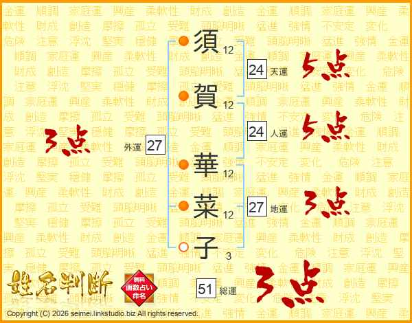 須(12画)賀(12画) 華(12画)菜(12画)子(3画)