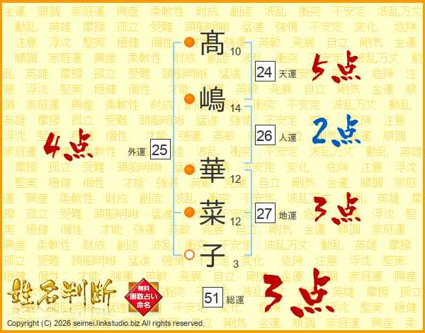 髙(10画)嶋(14画) 華(12画)菜(12画)子(3画)