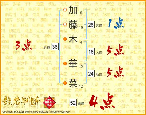 加(5画)藤(19画)木(4画) 華(12画)菜(12画)
