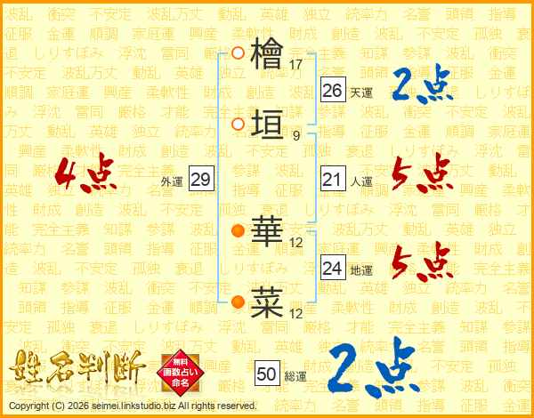 檜(17画)垣(9画) 華(12画)菜(12画)
