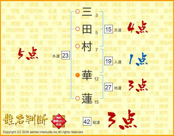 三(3画)田(5画)村(7画) 華(12画)蓮(15画)