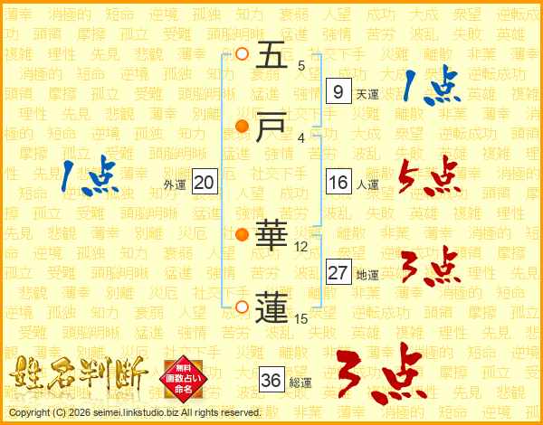 五(5画)戸(4画) 華(12画)蓮(15画)