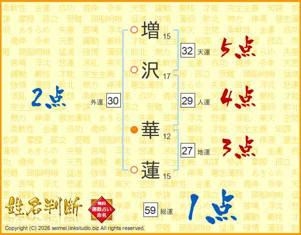 増(15画)沢(17画) 華(12画)蓮(15画)