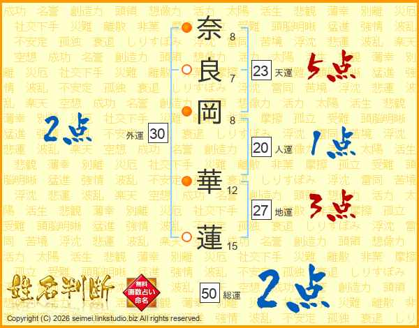 奈(8画)良(7画)岡(8画) 華(12画)蓮(15画)