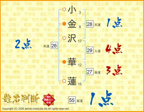 小(3画)金(8画)沢(17画) 華(12画)蓮(15画)
