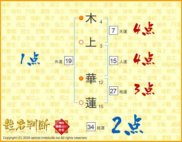生活面を象徴する運勢です。外部から受ける影響力を表し、結婚運、家庭運や職場、環境への順応性を表します。総運から人運を引いた画数。姓や名が1文字の場合を除く。
