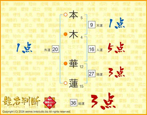 あなたの人生を表す1番重要な運勢です。生涯を通じて影響する総合運となり、主に50歳以降の晩年期に影響を及ぼします。苗字と名前の合計画数。