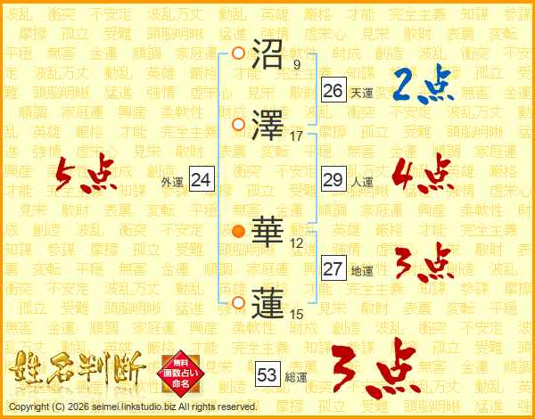 沼澤華蓮さんの天運は26画の2点!