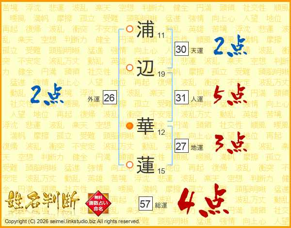 浦(11画)辺(19画) 華(12画)蓮(15画)