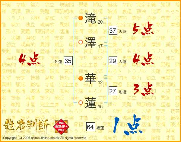 滝(20画)澤(17画) 華(12画)蓮(15画)