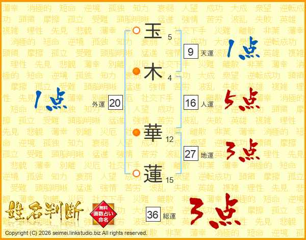 玉(5画)木(4画) 華(12画)蓮(15画)