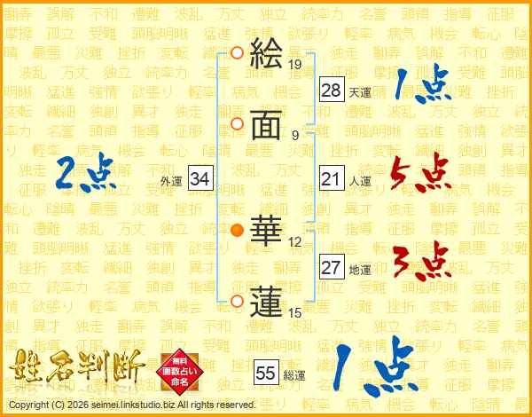 絵(19画)面(9画) 華(12画)蓮(15画)