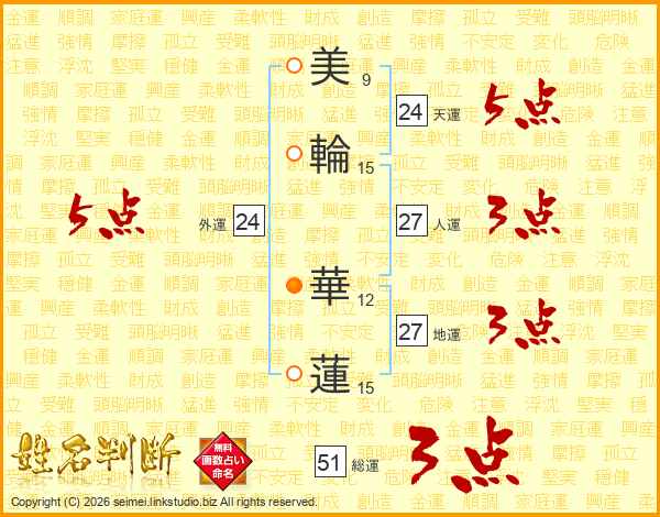美(9画)輪(15画) 華(12画)蓮(15画)