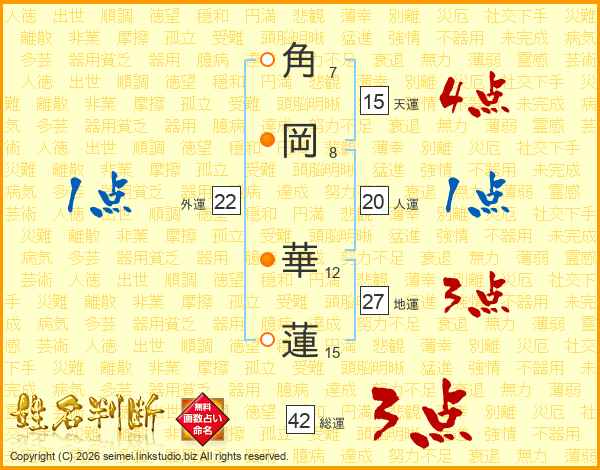 角(7画)岡(8画) 華(12画)蓮(15画)