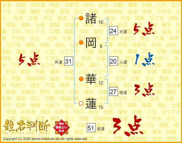 諸(16画)岡(8画) 華(12画)蓮(15画)