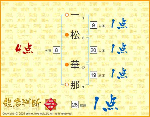 生活面を象徴する運勢です。外部から受ける影響力を表し、結婚運、家庭運や職場、環境への順応性を表します。総運から人運を引いた画数。姓や名が1文字の場合を除く。