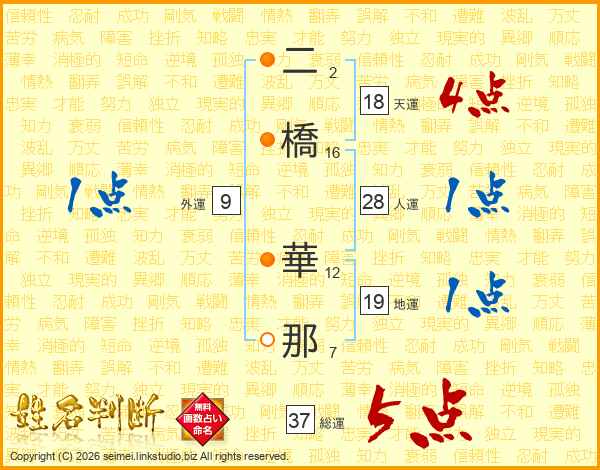 二橋華那さんの総運は37画の5点!
