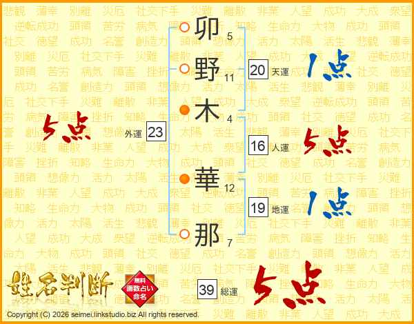 卯(5画)野(11画)木(4画) 華(12画)那(7画)