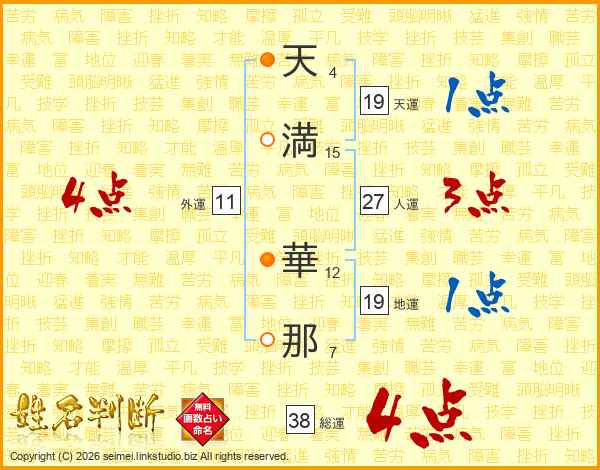 生活面を象徴する運勢です。外部から受ける影響力を表し、結婚運、家庭運や職場、環境への順応性を表します。総運から人運を引いた画数。姓や名が1文字の場合を除く。